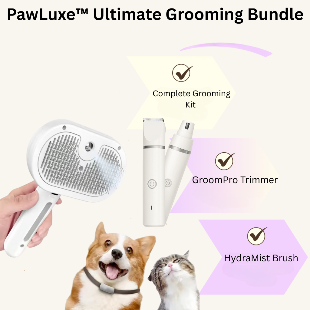 Give your furry friend the ultimate grooming experience with the PawLuxe™ Ultimate Grooming Bundle. The GroomPro 4-in-1 Kit is designed for precision trimming, de-shedding, and shaping, ensuring your pet’s fur is always in top condition. Paired with the HydraMist Self-Cleaning Brush, this bundle hydrates your pet's coat while detangling and reducing irritation. With interchangeable heads, self-cleaning features, and a built-in mist humidifier, this bundle ensures both comfort and convenience.