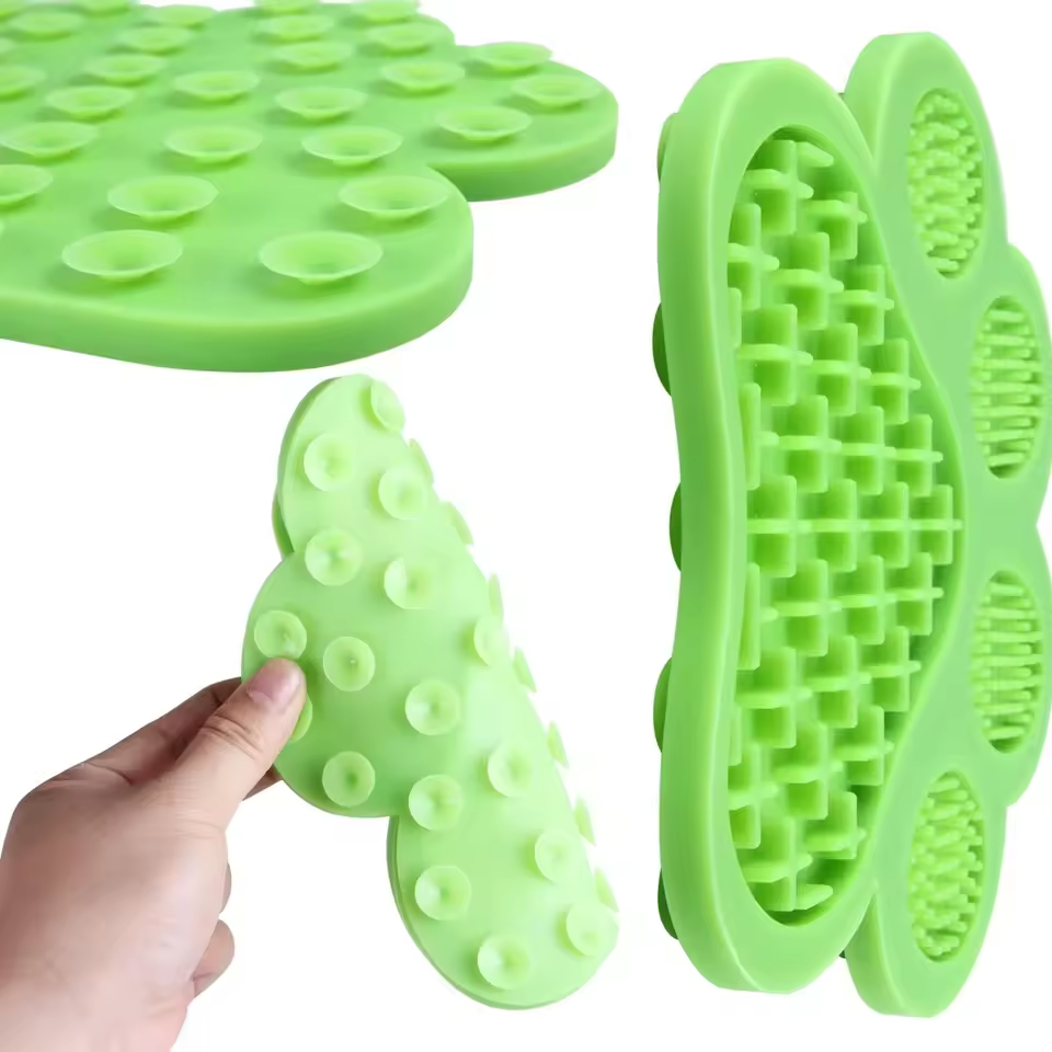Suction Cup Base: The strong suction cups securely attach to any flat surface, preventing the mat from sliding or moving, allowing your dog to focus on their food or licking.